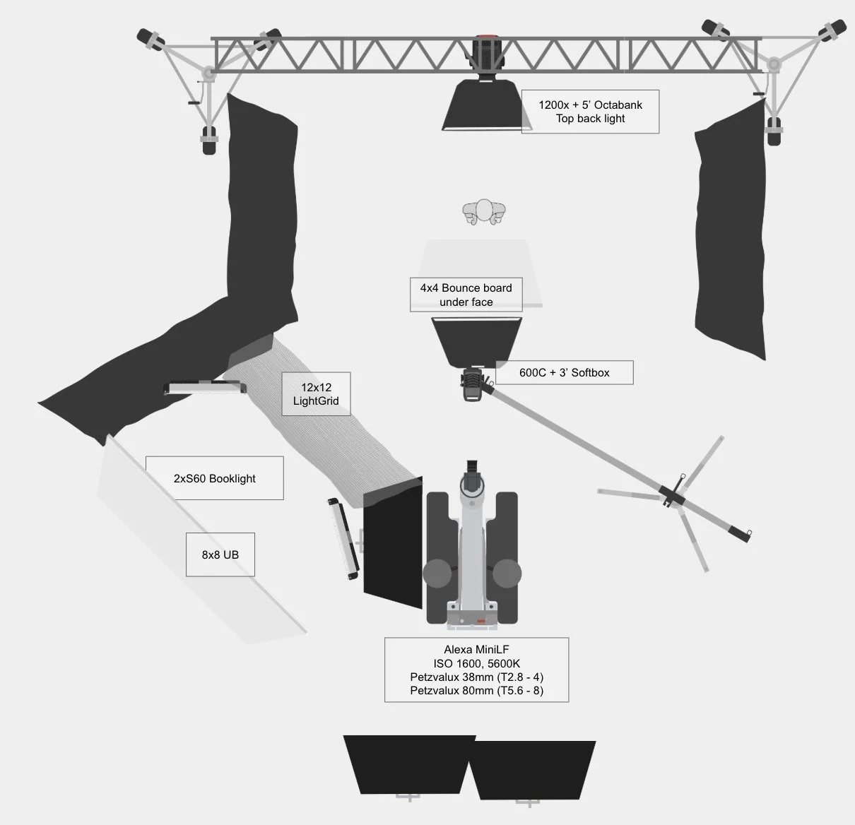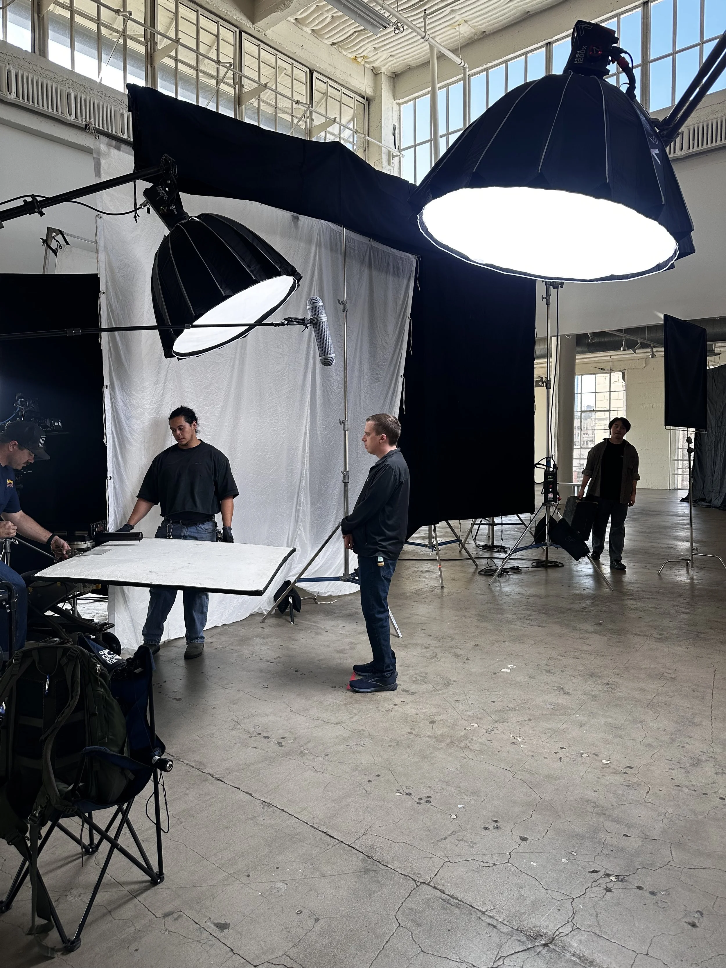 This was a simple interview style setup that we repeated with slight variation in different parts of the location. My natural instinct is to always key-light faces from the side, but I wanted to experiment with a more ambient and directionless light on the face. I went with the Aputure 600C with the 3’ Light dome as a frontal beauty light; with supplemental side-fill light from a 12x12 book light, and a bounce board that was right under the lens. I also had the 5’ Light dome as a toppy backlight that helped to activate the bounce board.